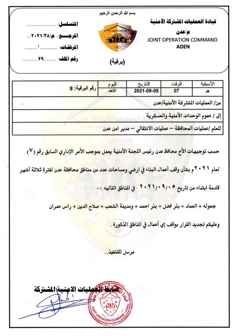 وبحسب التعميم الصادر عن العمليات المشتركة الأمنية / عدن، والموجه لعموم الوحدات الأمنية والعسكرية بالعاصمة عدن، فقد قضت توجيهات المحافظ بتجديد وقف أعمال البناء في أراضي ومساحات سبع مناطق وهي: / جعولة / بئر فضل / بئر احمد / مدينة الشعب / صلاح الدين / رأس عمران.