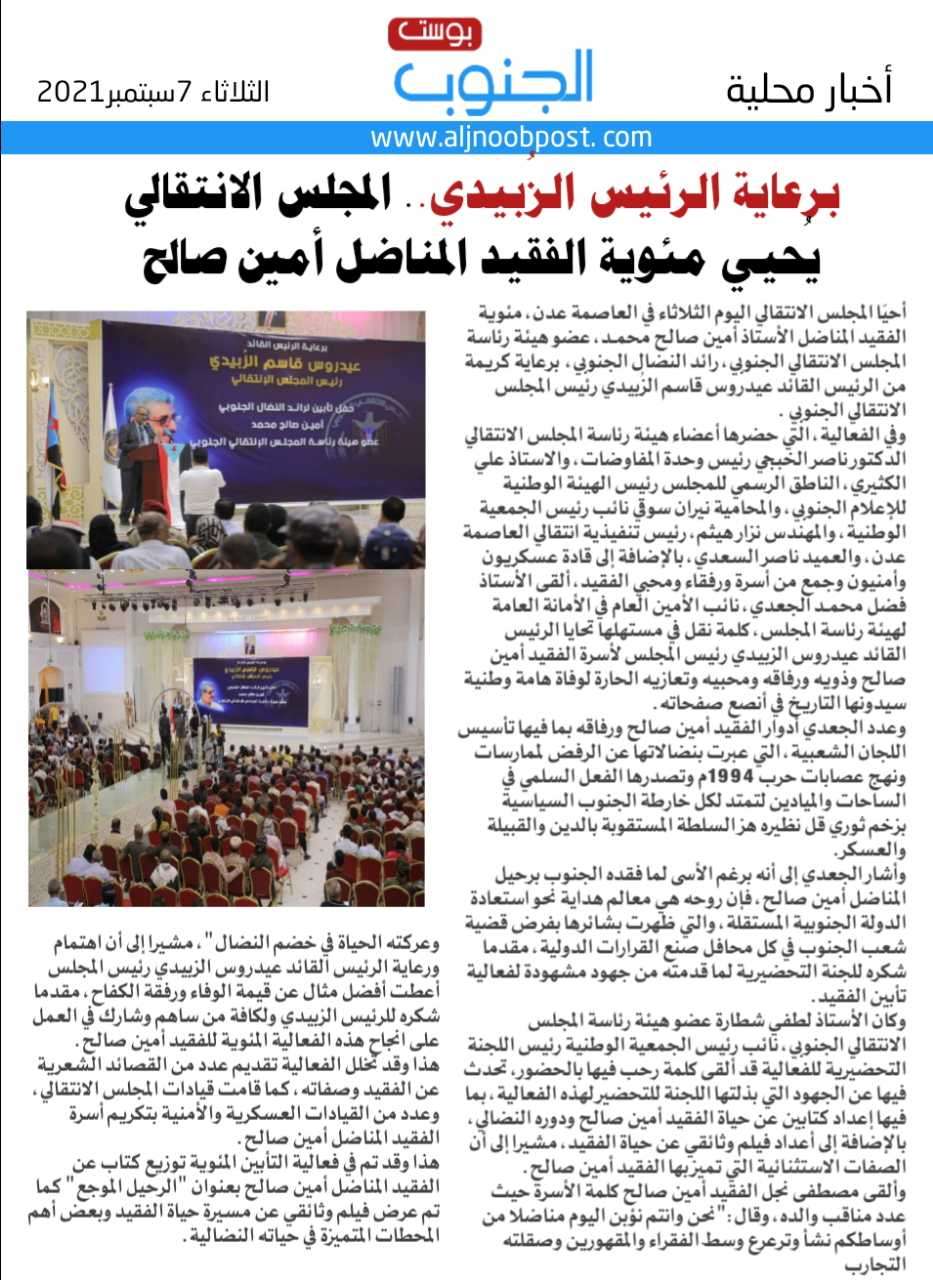 أحيّا المجلس الانتقالي اليوم الثلاثاء في العاصمة عدن، مئوية الفقيد المناضل الأستاذ أمين صالح محمـد، عضو هيئة رئاسة المجلس الانتقالي الجنوبي، رائد النضال الجنوبي، برعاية كريمة من الرئيس القائد عيدروس قاسم الزُبيدي رئيس المجلس الانتقالي الجنوبي .