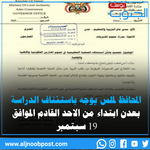 وجه محافظ العاصمة #عدن أحمد حامد لملس باستئناف الدراسة في عموم المدارس الحكومية والأهلية والخاصة بالعاصمة ابتدأ من يوم الأحد القادم الموافق 19 سبتمبر .