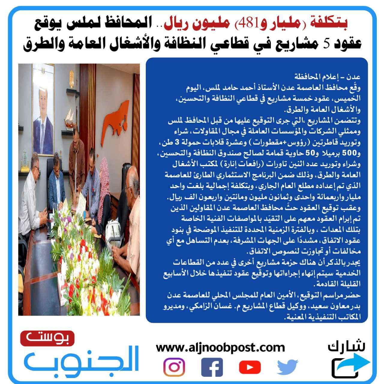 بتكلفة (مليار و481) مليون ريال المحافظ لملس يوقع عقود 5 مشاريع في قطاعي النظافة والأشغال العامة والطرق