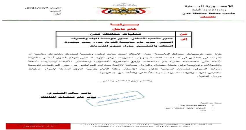 وجهت عمليات محافظة عدن، برقية عاجلة إلى مدراء مكاتب الأشغال والطرق، والمياة والصرف الصحي، والكهرباء، وصندوق النظافة والتحسين في المحافظة، ومدراء عموم مديريات عدن.