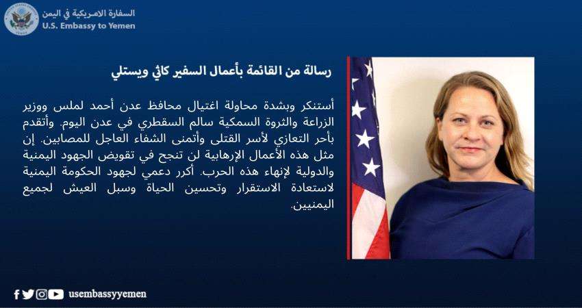 ووجهت القائمة بأعمال السفير الأميركي لدى اليمن، كاثي ويستلي، رسالة بخصوص محاولة اغتيال محافظ عدن ووزير الزراعة والثروة السمكية في عدن اليوم.