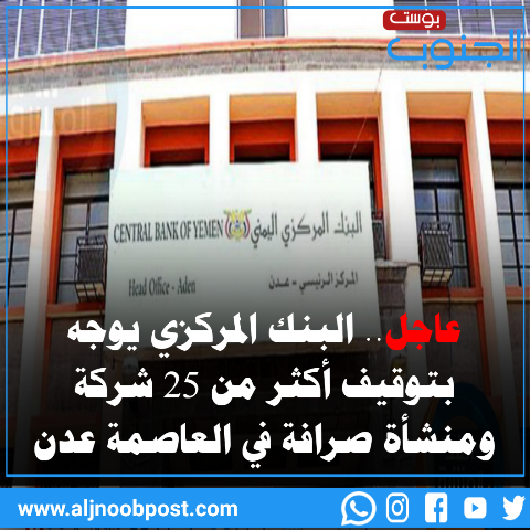 عاجل.. البنك المركزي يوجه بتوقيف أكثر من 25 شركة ومنشأة صرافة في العاصمة عدن