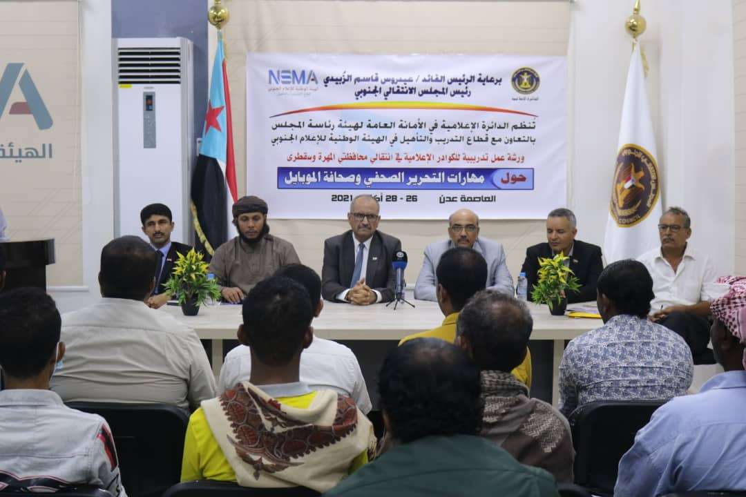 دشنت الدائرة الإعلامية في الأمانة العامة لهيئة رئاسة المجلس الانتقالي الجنوبي، بالتنسيق مع قطاع التدريب والتأهيل في الهيئة الوطنية للإعلام الجنوبي، اليوم الثلاثاء، في العاصمة عدن، ورشة عمل تدريبية تتمحور حول " مهارات التحرير الصحفي وصحافة الموبايل"، لإعلاميي قيادتي المجلس في محافظتي المهرة و سقطرى، برعاية الرئيس القائد عيدروس قاسم الزُبيدي، رئيس المجلس الانتقالي الجنوبي .