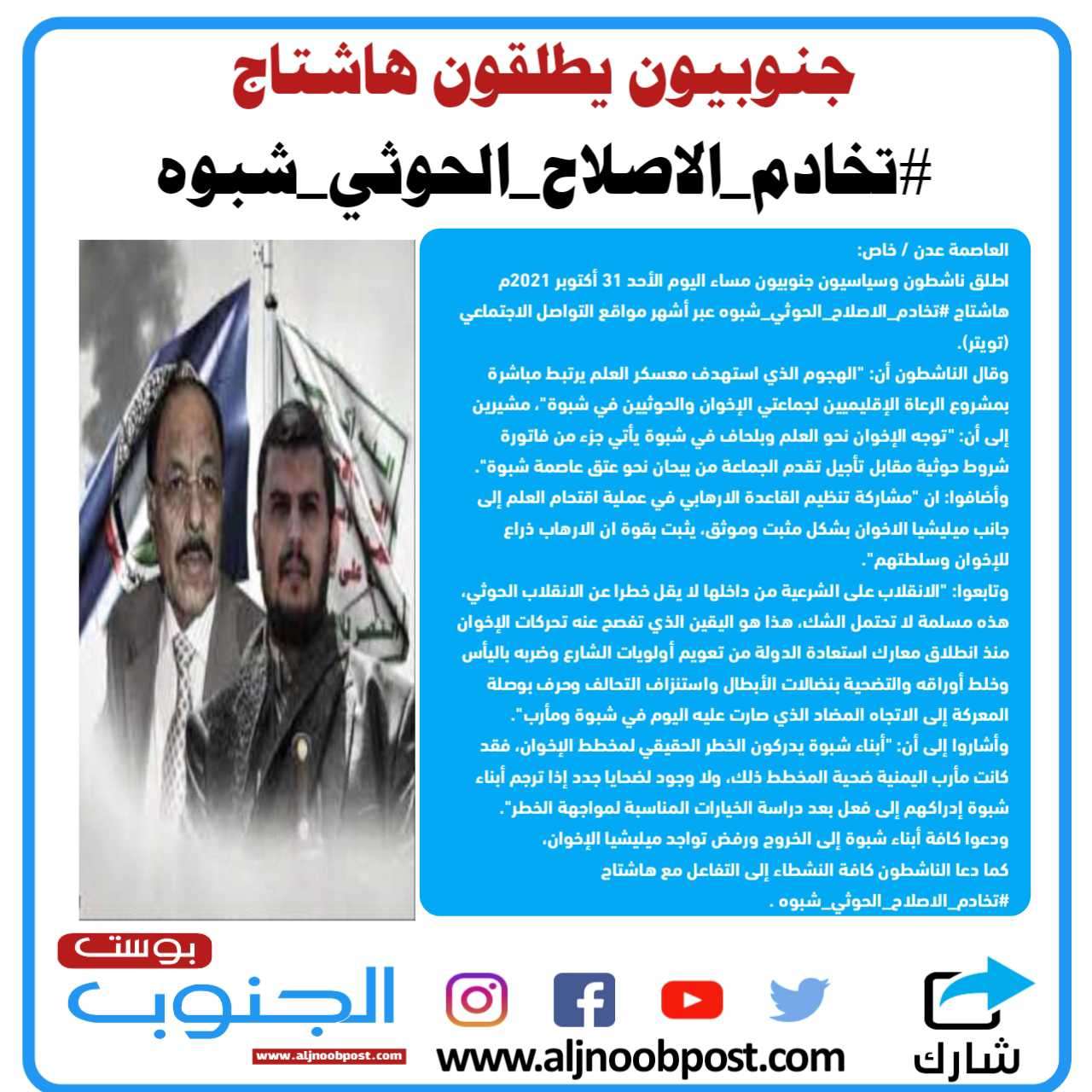 اطلق ناشطون وسياسيون جنوبيون مساء اليوم الأحد 31 أكتوبر 2021م هاشتاج #تخادم_الاصلاح_الحوثي_شبوه عبر أشهر مواقع التواصل الاجتماعي (تويتر).
