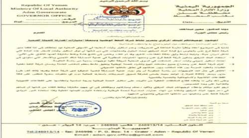 -التزام شركة النفط عدن بإخضاع جميع معاملات البيع والشراء للعملة الوطنية وتعليق نشاط المكاتب العاملة وضمان شركة النفط تغطية العمليات والعقود المبرمة بين هذه المكاتب وبين عملائهم في تعليق نشاطها التسويقي.