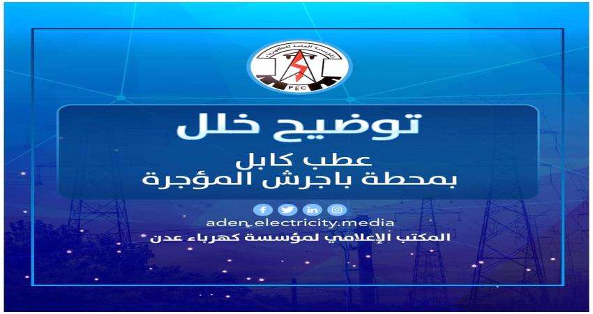 أوضحت المؤسسة العامة لكهرباء عدن للأخوة المواطنين بأن عطب بأحد الكابلات في محطة باجرش المؤجرة أخرج قدرتها التوليدية البالغة 40 ميجا عن الخدمة.