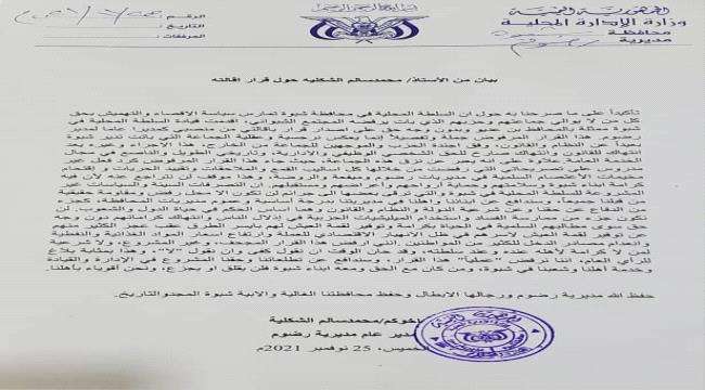 وأكد الشكلية في بيان صادر عنه، أن هذا قرار إقالته وغيرها من الإجراءات يعد إنتهاك للقانون والحق الشخصي الوظيفي والإدارية .. مشدداً على رفضه لهذا القرار المجحف وغير المشروع .