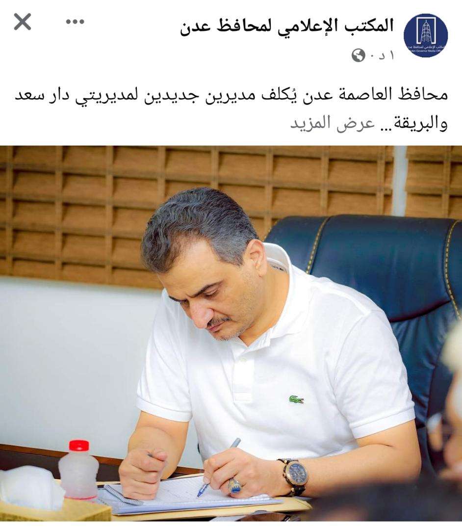أصدر الاستاذ احمد حامد لملس محافظ العاصمة عدن قراري تكليف لمديرين جديدين لمديريتي دار سعد والبريقة.