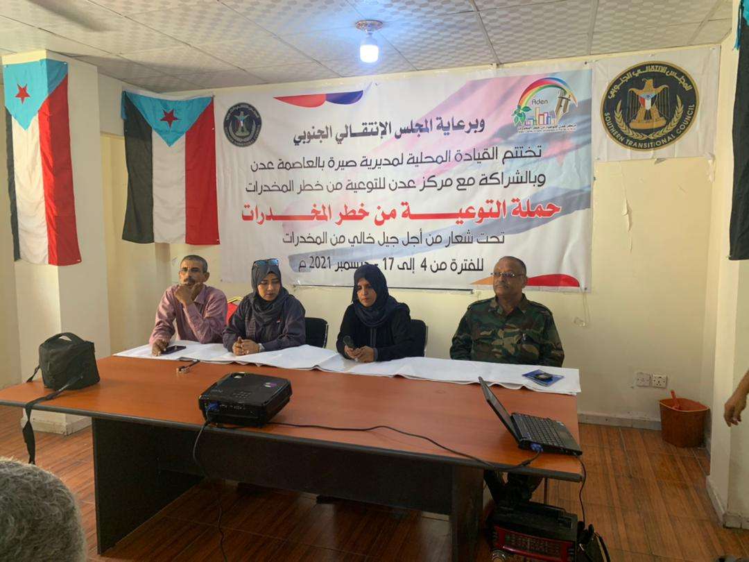 اختتمت القيادة المحلية للمجلس الانتقالي الجنوبي في مديرية صيرة بالعاصمة عدن، اليوم الخميس، حملة التوعية من خطر المخدرات في المديرية، بحضور المحامية نيران سوقي عضو هيئة رئاسة المجلس، نائبة رئيس الجمعية الوطنية.