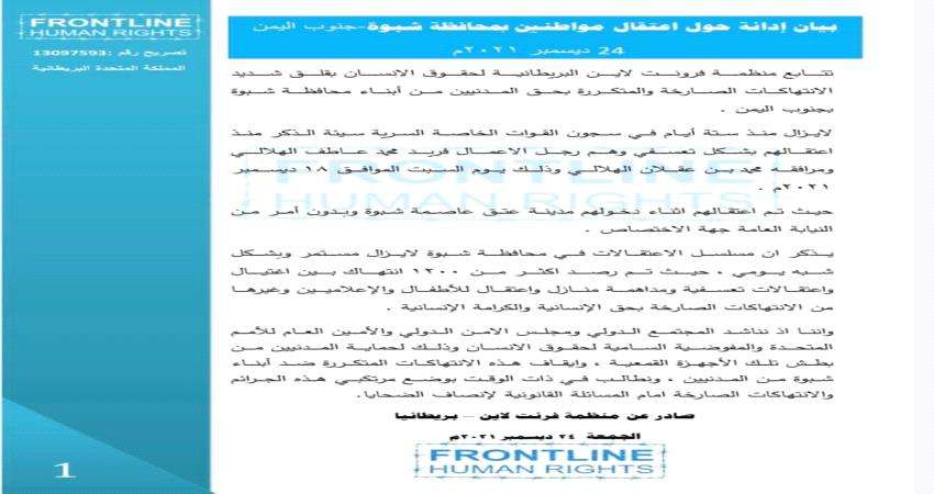 تتابع منظمة فرونت لاين البريطانية لحقوق الإنسان بقلق شديد الانتهاكات الصارخة والمتكررة بحق المدنيين من أبناء محافظة شبوة بجنوب اليمن .