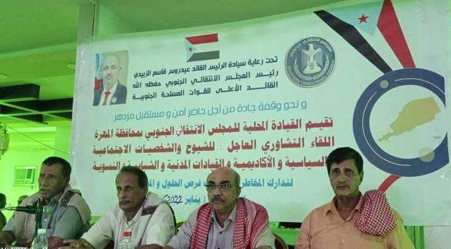 عقدت القيادة المحلية للمجلس الجنوبي بمحافظة المهرة صباح اليوم لقاء تشاوريا عاجلاً بحضور الأستاذ سعيد سعدان عضو هيئة رئاسة المجلس الانتقالي، وضم جمعاً كبيراً من الشيوخ، والشخصيات الاجتماعية والسياسية والأكاديمية، وأعضاء الجمعية الوطنية، وقيادات مدنية، وشبابية، ونسوية من أبناء المحافظة، لتدارس المخاطر والتحديات الحاضرة والمستقبلية التي تواجها محافظة المهرة في مطلع العام الجديد.