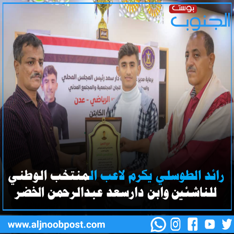برعاية مدير دار سعد رئيس المجلس المحلي رائد الطوسلي والمجلس الانتقالي واللجان المجتمعية والمجتمع المدني كرم نادي النصر الرياضي - عدن.. ابن دار سعد و لاعب المنتخب الوطني للناشئين الكابتين عبدالرحمن الخضر