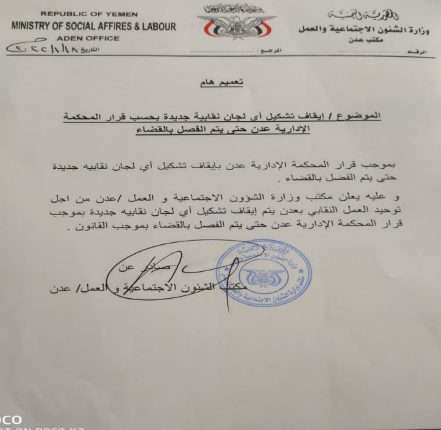 أصدر مكتب وزارة الشؤون الاجتماعية والعمل في العاصمة عدن تعميم هام بأيقاف تشكيل اي نقابات جديده بمرافق الدوله بالعاصمة عدن بناء على قرار المحكمة الإدارية عدن بإيقاف تشكيل أي نقابات جديده حتى يتم الفصل بقضية النقابات من قبل القضاء وجاء هذا القرار تنفيذاً لقرار المحكمة الإدارية عدن لتوحيد العمل النقابي بمؤسسات الدولة بالعاصمة عدن وإيقاف الصراع النقابي التي أثرت على مسيرة التنمية والاستقرار والبناء لمؤسسات الدولة بالعاصمة عدن التي يقودها محافظ العاصمة عدن الأستاذ أحمد حامد لملس لإنجاح جهود اتفاق الرياض وإعادة الحياة الطبيعية للعاصمة عدن .