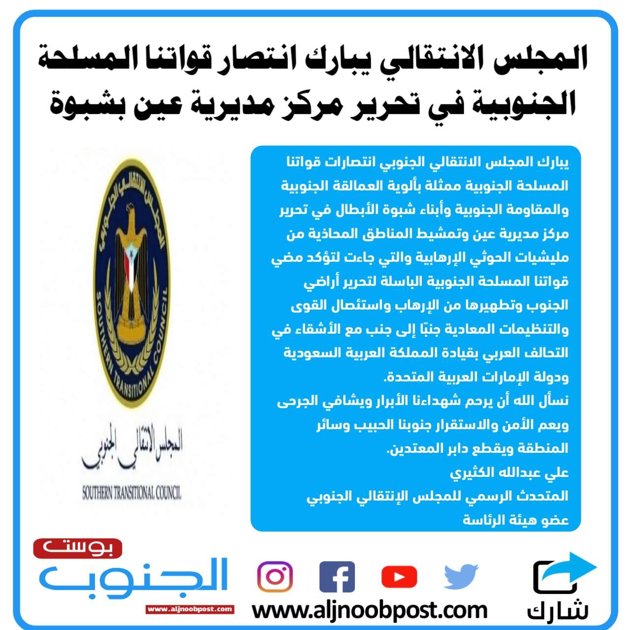 يبارك المجلس الانتقالي الجنوبي انتصارات قواتنا المسلحة الجنوبية ممثلة بألوية العمالقة الجنوبية والمقاومة الجنوبية وأبناء شبوة الأبطال في تحرير مركز مديرية عين وتمشيط المناطق المحاذية من مليشيات الحوثي الإرهابية والتي جاءت لتؤكد مضي قواتنا المسلحة الجنوبية الباسلة لتحرير أراضي الجنوب وتطهيرها من الإرهاب واستئصال القوى والتنظيمات المعادية جنبًا إلى جنب مع الأشقاء في التحالف العربي بقيادة المملكة العربية السعودية ودولة الإمارات العربية المتحدة.