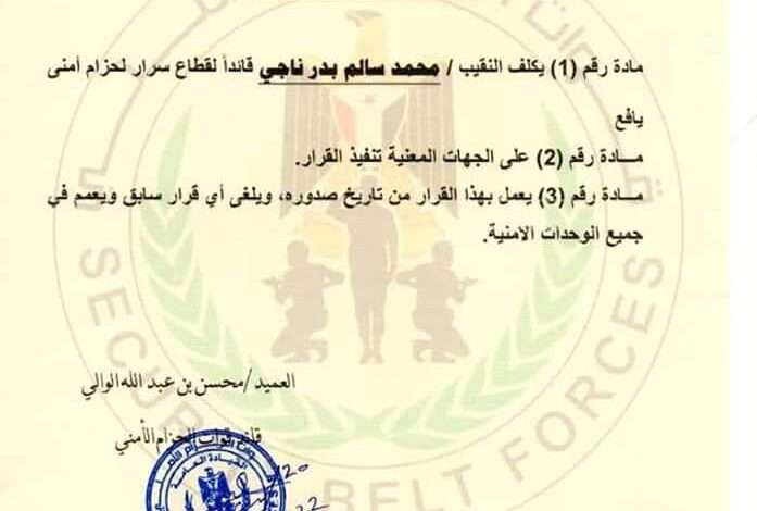كما نص القرار رقم 4 لعام 2022م تكليف النقيب محمد سالم بدر قائداً لقطاع سرار .