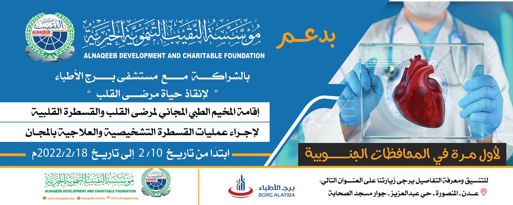 وكان المخيم الطبي المجاني في مركز القلب والقسطرة القلبية بمستشفى برج الأطباء عدن قد أعلن في وقت سابق عن فتح باب التسجيل لعلاج وإنقاذ مرضى القلب وإجراء عمليات القسطرة التشخيصية والعلاجية بالمجان لجميع الفئات المعدمة والفقيرة التي لا تستطيع تحمل تكاليف عمليات القسطرة القلبية وهو لأول مرة يحدث في الجنوب.