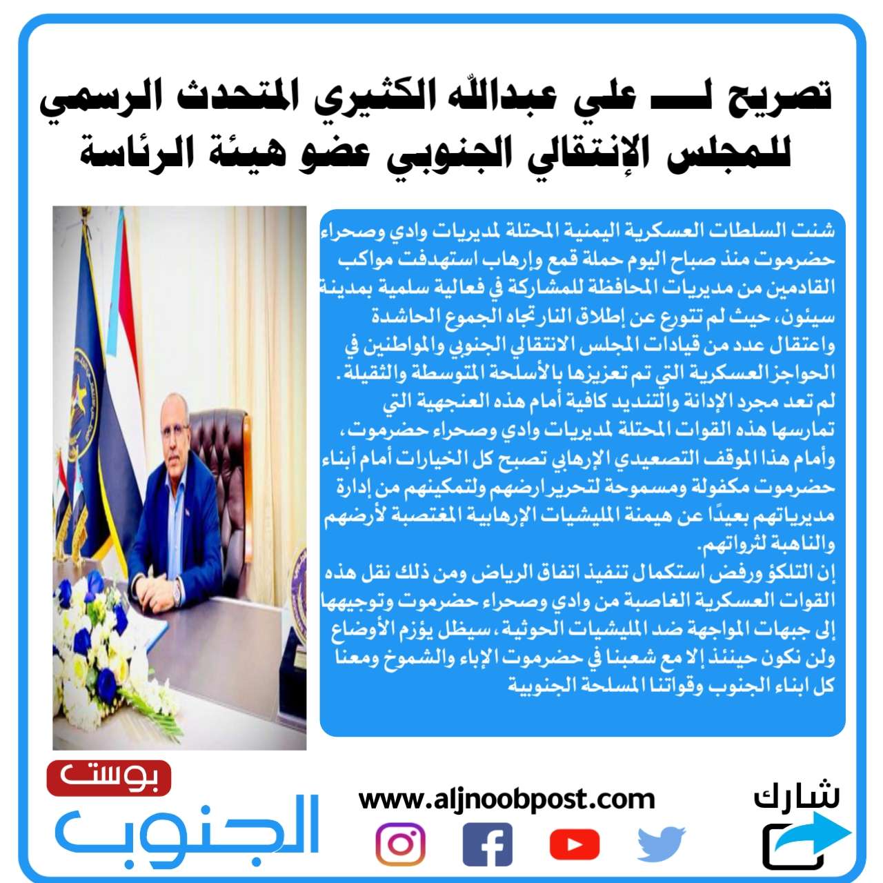 تصريح لــــ علي عبدالله الكثيري المتحدث الرسمي للمجلس الإنتقالي الجنوبي عضو هيئة الرئاسة