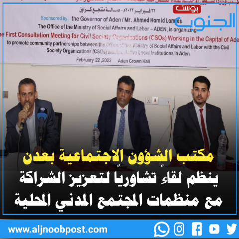 وهدف اللقاء التشاوري إلى تعزيز الشراكة المجتمعية بين مكتب وزارة الشئون الاجتماعية والعمل، وبين المؤسسات المحلية ومنظمات المجتمع المدني الفاعلة في العاصمة عدن.