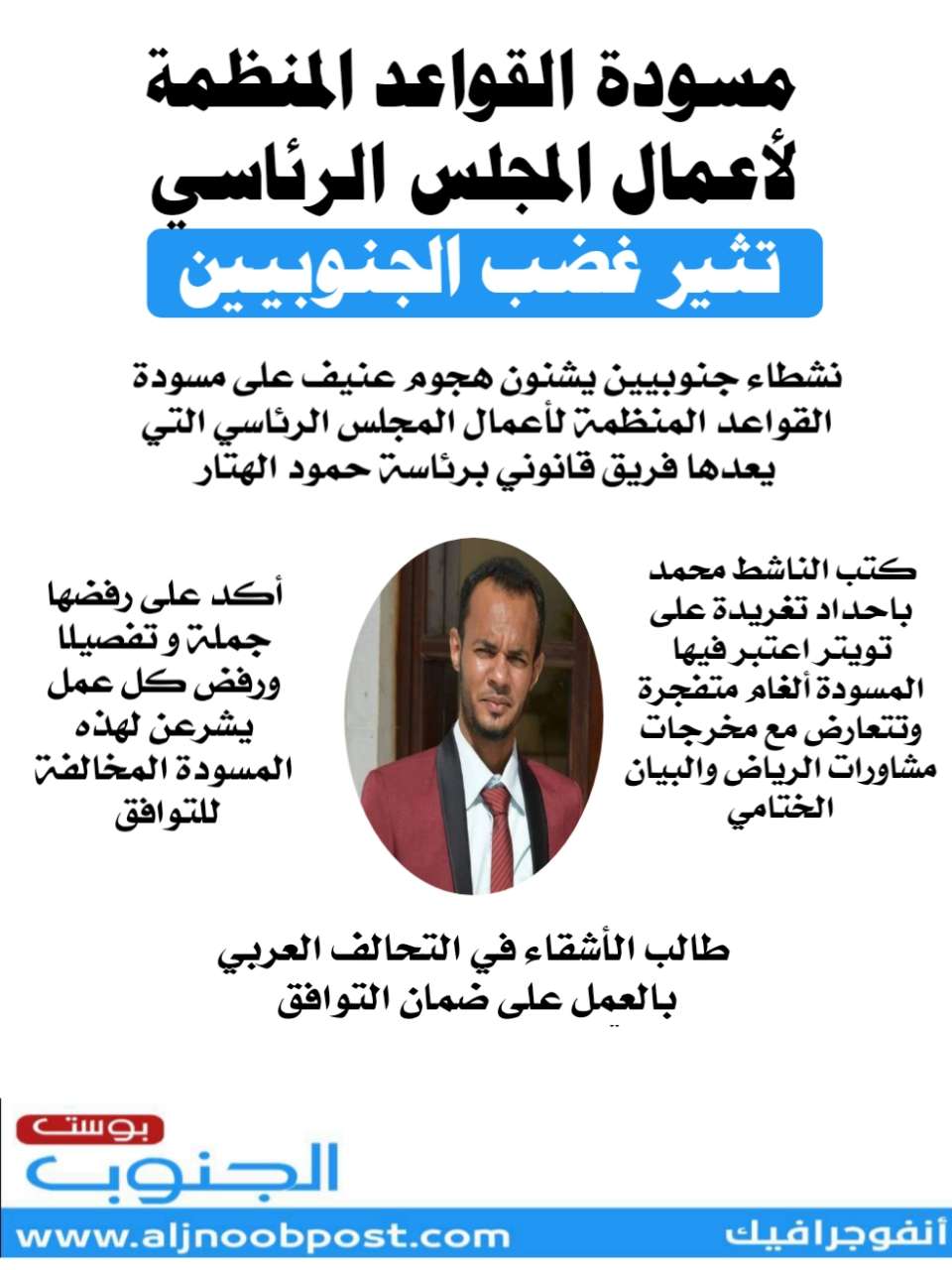 مسودة القواعد المنظمة لأعمال المجلس الرئاسي تثير غضب الجنوبيين @m_bahdad https://t.co/GDPzmlOuWQ