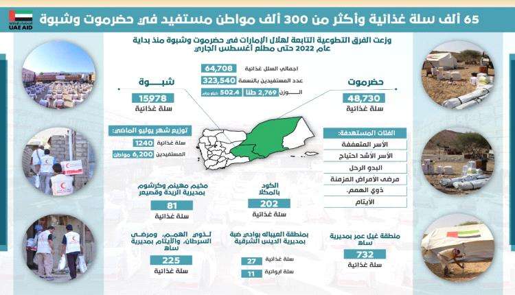 وزعت الفرق التطوعية التابعة للهلال الأحمر الإماراتي(64,708) سلة غذائية تزن 2,769 طنا و 502.4 كيلو جرام أستفاد منها 323,540 مواطن في حضرموت وشبوة منذ بداية عام 2022 حتى مطلع أغسطس الجاري.