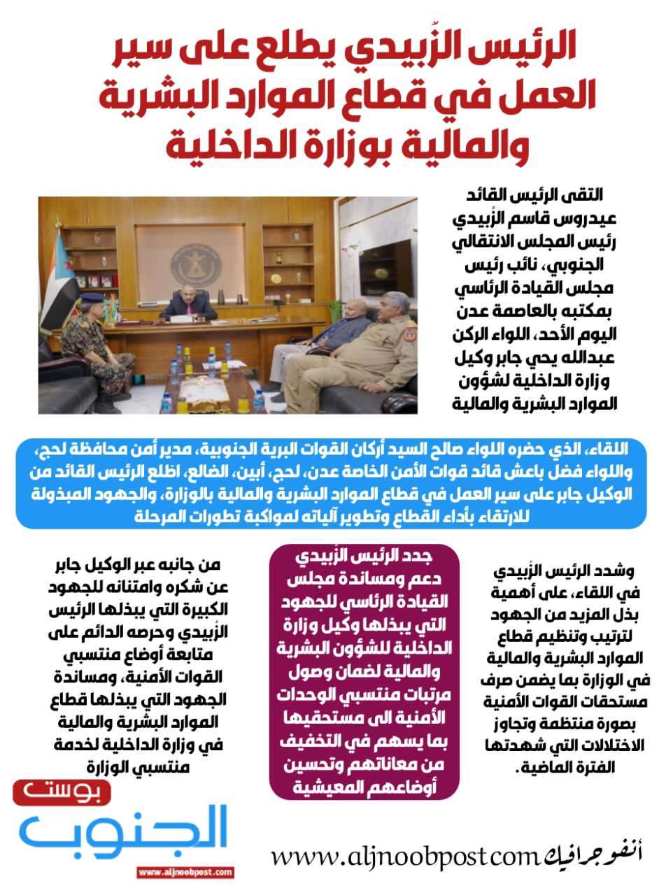 انفوجرافيك.. الرئيس الزُبيدي يطلع على سير العمل في قطاع الموارد البشرية والمالية بوزارة الداخلية