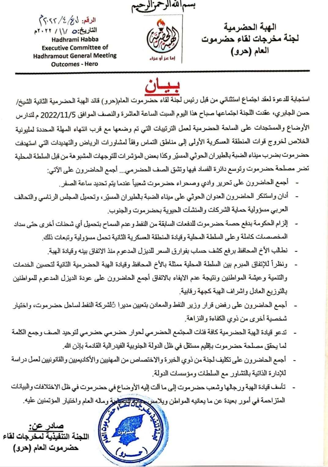 تدعو قيادة الهبة الحضرمية كافة فئات المجتمع الحضرمي لحوار حضرمي حضرمي لتوحيد الصف وجمع الكلمة لما يحقق مصلحة حضرموت بأقليم مستقل في ظل الدولة الجنوبية الفيدرالية القادمة بإذن الله.