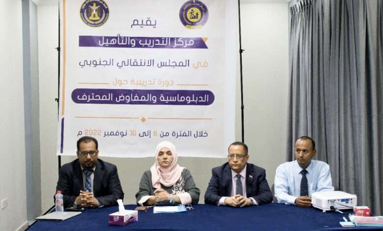 نظم مركز التدريب والتأهيل في المجلس الانتقالي الجنوبي، اليوم الأحد، في العاصمة عدن، دورة تدريبية بعنوان” الدبلوماسية والمفاوض المحترف” لعدد من كوادر مختلف هيئات المجلس الانتقالي، بحضور عضوي هيئة رئاسة المجلس، الدكتور ناصر الخبجي، رئيس وحدة شؤون المفاوضات، والدكتورة سهير علي احمد.