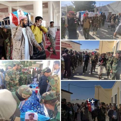 في موكب جنائزي مهيب ، شيعت جموع حاشدة من أبناء محافظة شبوة بعد ظهر اليوم السبت جثامين اربعة شهداء من قوات دفاع شبوة اللواء الاول الذين استشهدوا في التفجير الإرهابي الذي تعرضوا له مساء أمس الجمعة في وادي السر بمنطقة المصينعة التابعة إداريا لمديرية صعيد يشبم ، وهم قائد الكتيبة الثانية سالم محمد المرزقي ورفاقه فريد احمد عوض ونائف حسين منصور وعلي ناجي .