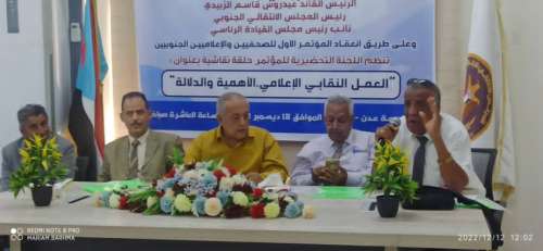 نظمت اللجنة التحضيرية للمؤتمر الأول للصحفيين والإعلاميين الجنوبيين حلقة نقاشية بعنوان: " العمل النقابي الإعلامي.. الأهمية والدلالة"، في مركز التدريب والتأهيل الإعلامي التابع للهيئة الوطنية للإعلام الجنوبي بالعاصمة عدن، صباح الإثنين 12 ديسمبر 2022م. وبرعاية من الرئيس القائد عيدروس قاسم الزبيدي رئيس المجلس الانتقالي الجنوبي نائب رئيس مجلس القيادة الرئاسي.