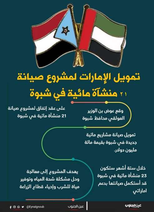 واشاروا إلى أن ما تقدمه الامارات للجنوب ومن خلال هذا المشروع او غيره ضمن استراتيجية الخمسين ومبادئها العشرة والتي ترى ان العيش الكريم للشعوب الحل الأمثل لتحقيق الامن والاستقرار ووقف النزاعات.