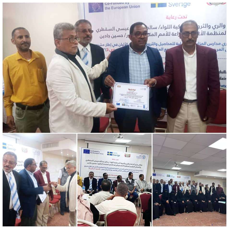 اختتمت اليوم في عدن ورشة ندريب مبسري مدارس المزارعين الحقليه للمحاصيل والتروه الحيوانيه والألبان في إطار مشروع دعم سبل العيش المرن والأمن الغدائي والتكييف مع المناخ في اليمن. ( الصمود الريفي ٣) تحت رعاية وزارة الزراعه والري والتروه الحيوانيه ومنظمة الاعديه والزراعه للأمم المتحده