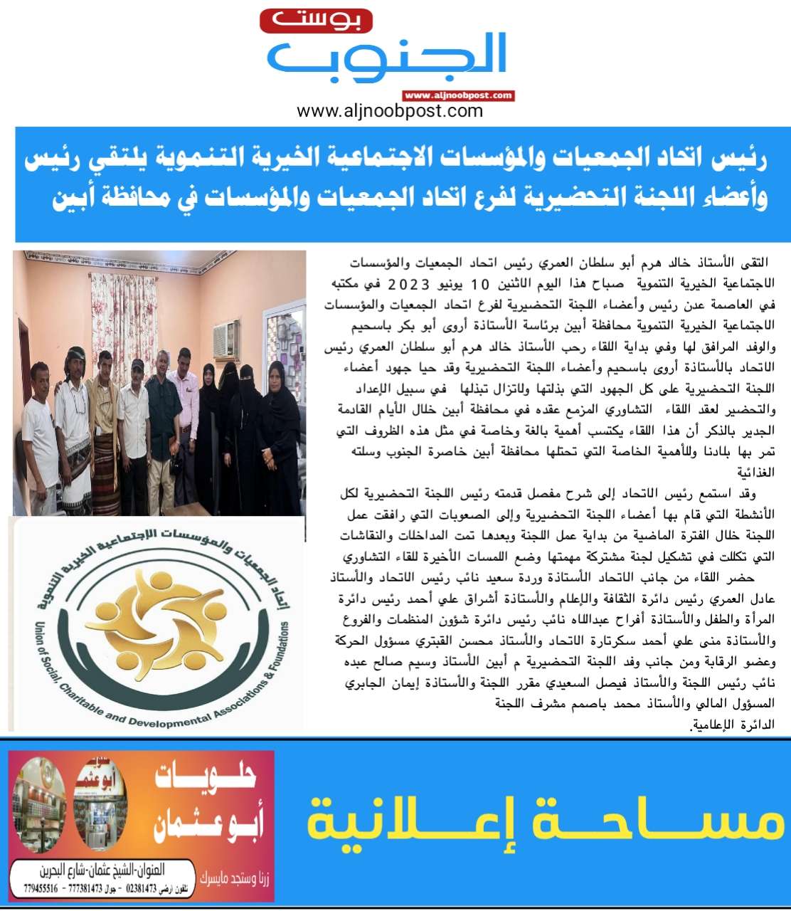 التقى الأستاذ خالد هرم أبو سلطان العمري رئيس اتحاد الجمعيات والمؤسسات الاجتماعية الخيرية التنموية صباح هذا اليوم الاثنين 10 يونيو 2023 في مكتبه في العاصمة عدن رئيس وأعضاء اللجنة التحضيرية لفرع اتحاد الجمعيات والمؤسسات الاجتماعية الخيرية التنموية محافظة أبين برئاسة الأستاذة أروى أبو بكر باسحيم والوفد المرافق لها وفي بداية اللقاء رحب الأستاذ خالد هرم أبو سلطان العمري رئيس الاتحاد بالأستاذة أروى باسحيم وأعضاء اللجنة التحضيرية وقد حيا جهود أعضاء اللجنة التحضيرية على كل الجهود التي بذلتها ولاتزال تبذلها في سبيل الإعداد والتحضير لعقد اللقاء التشاوري المزمع عقده في محافظة أبين خلال الأيام القادمة الجدير بالذكر أن هذا اللقاء يكتسب أهمية بالغة وخاصة في مثل هذه الظروف التي تمر بها بلادنا وللأهمية الخاصة التي تحتلها محافظة أبين خاصرة الجنوب وسلته الغذائية