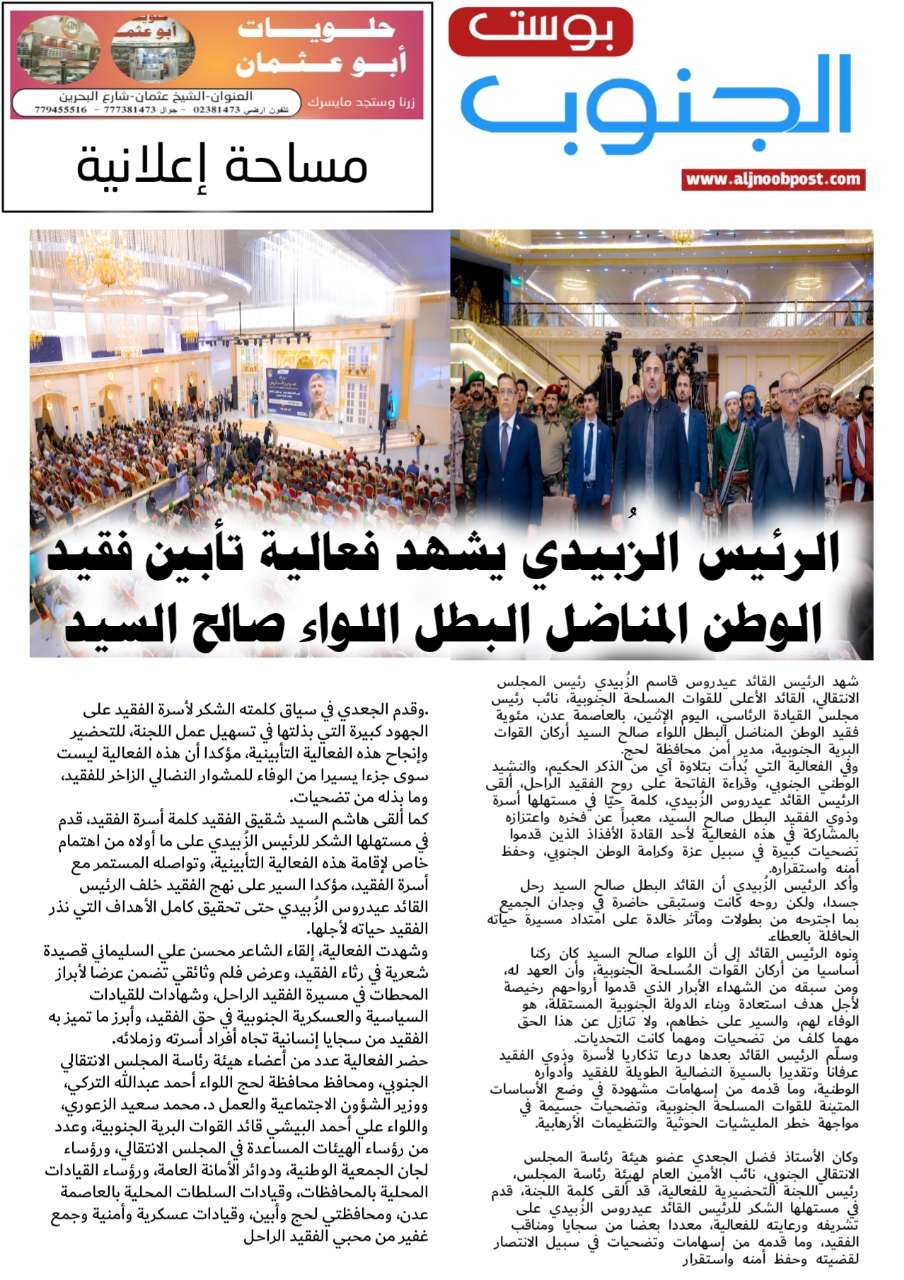 شهد الرئيس القائد عيدروس قاسم الزُبيدي رئيس المجلس الانتقالي، القائد الأعلى للقوات المسلحة الجنوبية، نائب رئيس مجلس القيادة الرئاسي، اليوم الإثنين، بالعاصمة عدن، مئوية فقيد الوطن المناضل البطل اللواء صالح السيد أركان القوات البرية الجنوبية، مدير أمن محافظة لحج.