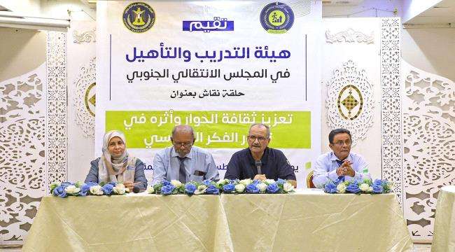 نظمت هيئة التدريب والتأهيل في المجلس الانتقالي الجنوبي، اليوم الأحد، حلقه نقاشية حول تعزيز ثقافة الحوار وأثره في تطوير الفكر السياسي، بحضور الأستاذ فضل محمد الجعدي عضو هيئة الرئاسة، نائب الأمين العام.