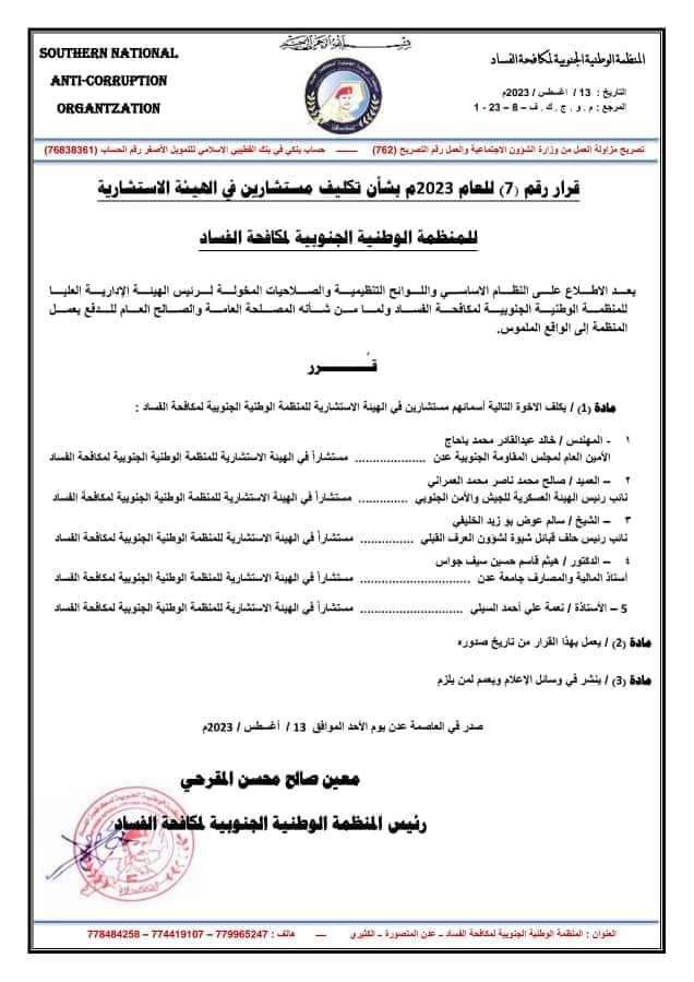 قرارات صادرة عن المنظمة الوطنية الجنوبية لمكافحة الفساد