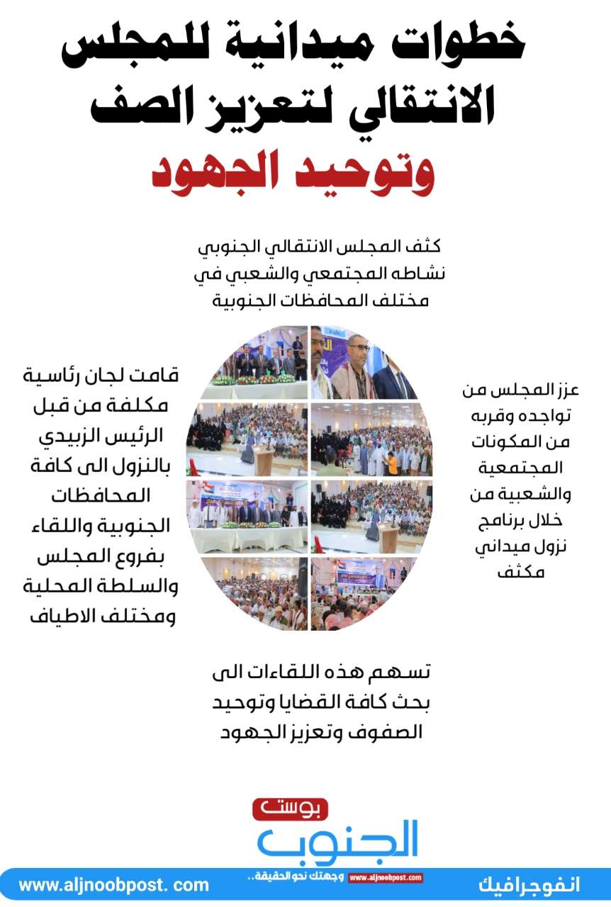 ‏انفوجرافيك خطوات ميدانية للمجلس الانتقالي لتعزيز الصف وتوحيد الجهود ‎
