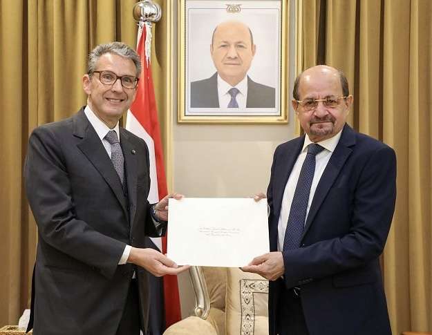 تسلم وزير الخارجية وشؤون المغتربين، الدكتور شائع الزنداني، اليوم، نسخة من أوراق اعتماد السفير كارلو بالدوتشي، سفير جمهورية إيطاليا الصديقة غير المقيم لدى الجمهورية اليمنية.