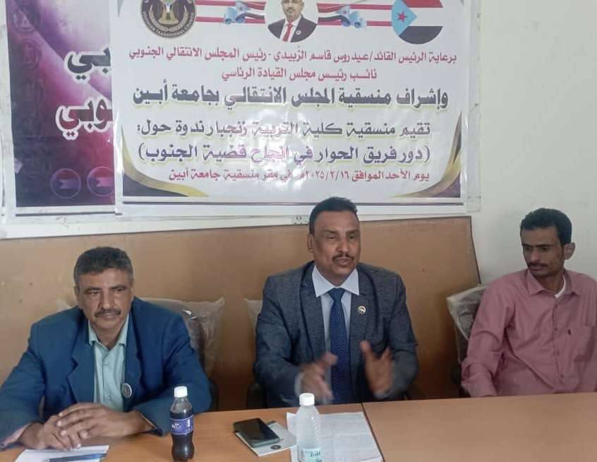 نظمت منسقية المجلس الانتقالي الجنوبي في كلية التربية زنجبار بجامعة أبين، اليوم الأحد، ندوة بعنوان "دور فريق الحوار في إنجاح قضية الجنوب".