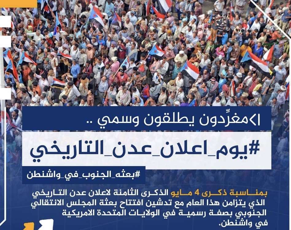 أطلق ناشطون جنوبيون حملة الكترونية تحت وسم يوم إعلان عدن التاريخي احتفاءً بالذكرى الثامنة للتفويض الشعبي الجنوبي" باعتباره محطة مفصلية في مسار نضاله الوطني، وذلك بالتزامن مع تدشين افتتاح بعثة المجلس الانتقالي رسميا في العاصمة الأمريكية واشنطن.