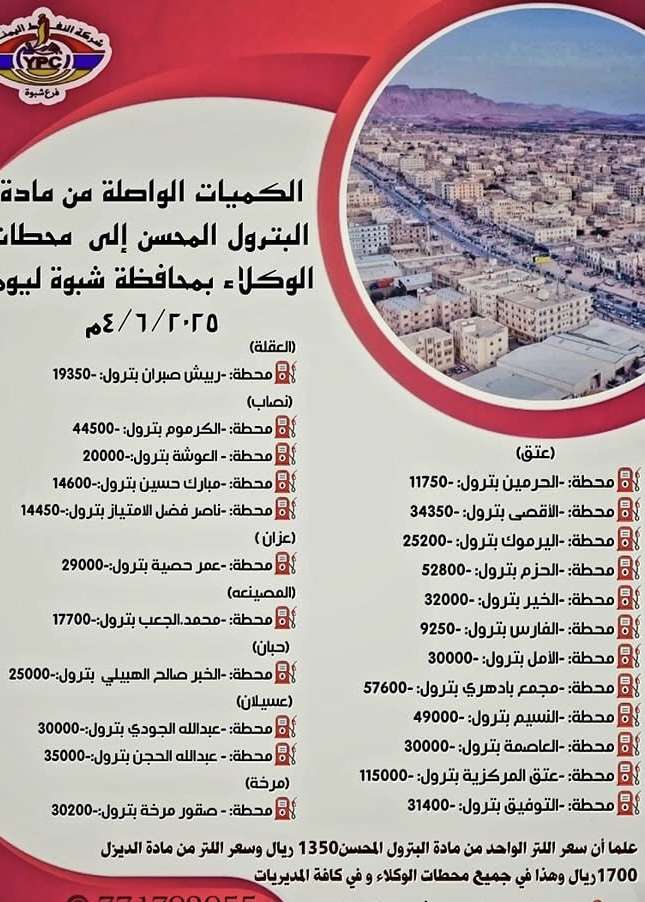 أعلنت شركة النفط اليمنية - فرع محافظة شبوة، اليوم، عن وصول كميات جديدة من مادتي البترول والديزل إلى محطات وكلائها المنتشرة في جميع مديريات المحافظة، في إطار جهودها لضمان الاستقرار التمويني وتلبية احتياجات المواطنين من المشتقات النفطية.