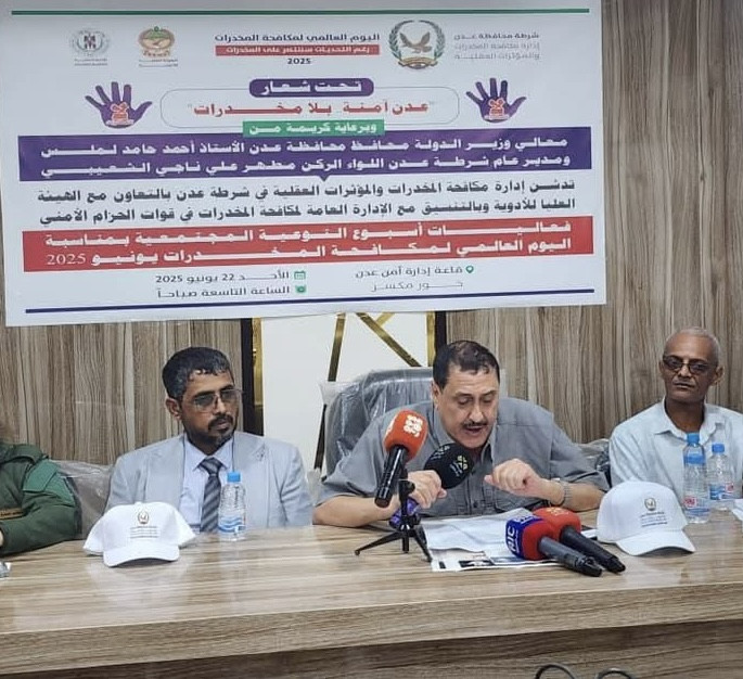 دشّنت إدارة مكافحة المخدرات في أمن العاصمة عدن، اليوم، فعاليات أسبوع التوعية المجتمعية بمناسبة اليوم العالمي لمكافحة المخدرات لعام 2025، تحت شعار: "عدن آمنة... بلا مخدرات". جاء ذلك برعاية من محافظ العاصمة عدن، الأستاذ أحمد حامد لملس، واللواء الركن مطهر الشعيبي، مدير عام شرطة العاصمة، وبمشاركة الهيئة العليا للأدوية والإدارة العامة لمكافحة المخدرات في قوات الحزام الأمني.