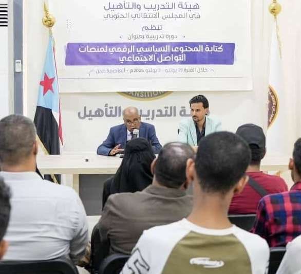 دشنت هيئة التدريب والتأهيل المساعدة لهيئة رئاسة المجلس الانتقالي الجنوبي، اليوم الأحد، دورة تدريبية في كتابة المحتوى السياسي الرقمي لمنصات التواصل الاجتماعي، تستهدف عددًا من كوادر المجلس العاملين في المجال الإعلامي والسياسي.