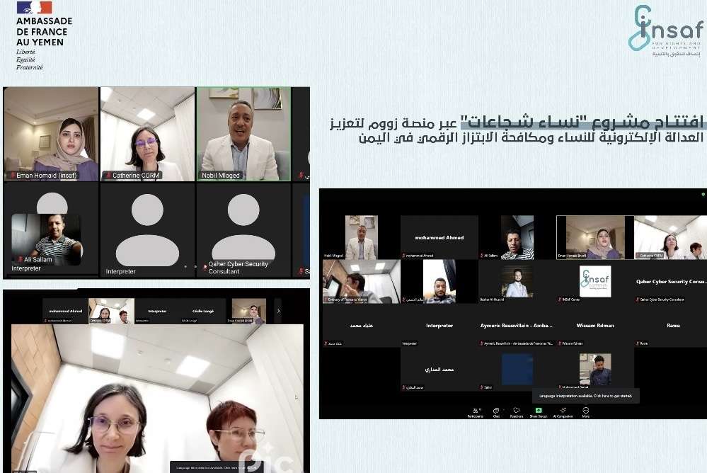 دشن مركز إنصاف للحقوق والتنمية، اليوم الإثنين، الموافق 30 يونيو 2025، فعالية افتتاح مشروع “تعزيز العدالة الإلكترونية للنساء – نساء شجاعات” عبر منصة “زووم”، وذلك بدعم من السفارة الفرنسية في اليمن، بمشاركة ممثلي الجهات الحكومية، والدبلوماسيين، وممثلي منظمات المجتمع المدني، والناشطين في مجال حقوق الإنسان.