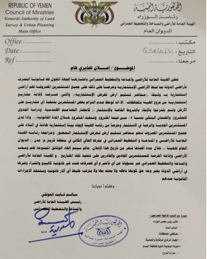ويظهر هذا التحذير، الذي وقع عليه رئيس الهيئة العامة للأراضي والمساحة والتخطيط العمراني الاستاذ سالم العولقي، جدية الإدارة في إنهاء حالة الجمود في القطاع الاستثماري واستعادة الأراضي غير المستغلة لتوجيهها نحو مشاريع تنموية حقيقية.