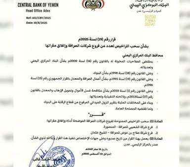 كما أصدر محافظ البنك، القرار رقم (19) للعام 2025م، بشأن سحب التراخيص الممنوحة لفرع شركة الشعيبي للصرافة بالمنصورة، وفرع شركة صلاح بن عوض للصرافة في الشيخ عثمان، واغلاق مقراتهما، وذلك بعد أن ثبت مخالفتها بتقرير النزول الميداني المرفوع من قطاع الرقابة على البنوك.