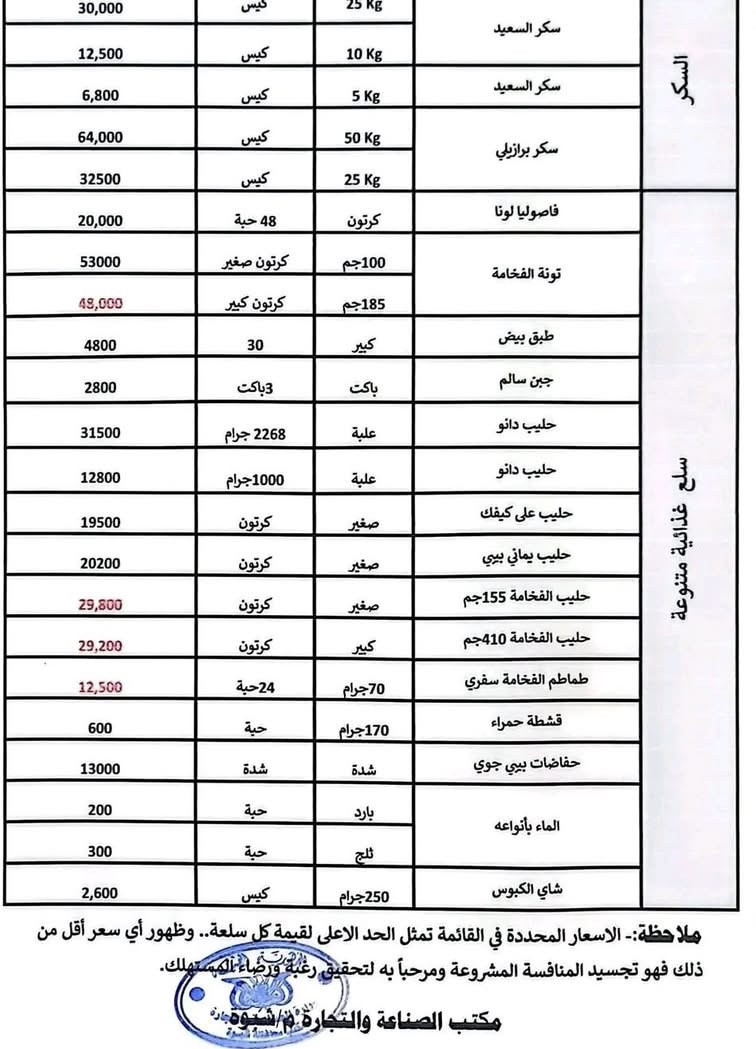 في إطار توجيهات محافظ محافظة شبوة، رئيس المجلس المحلي، عوض محمد بن الوزير، الرامية إلى دعم الإجراءات الحكومية وتوجهات البنك المركزي الهادفة إلى تعزيز الاستقرار الاقتصادي وضبط حركة الأسعار، خاصة في ظل التغيرات الأخيرة في قيمة الريال اليمني أمام العملات الأجنبية، أعلن مكتب الصناعة والتجارة بالمحافظة القائمة المؤقتة لأسعار المواد الأساسية.