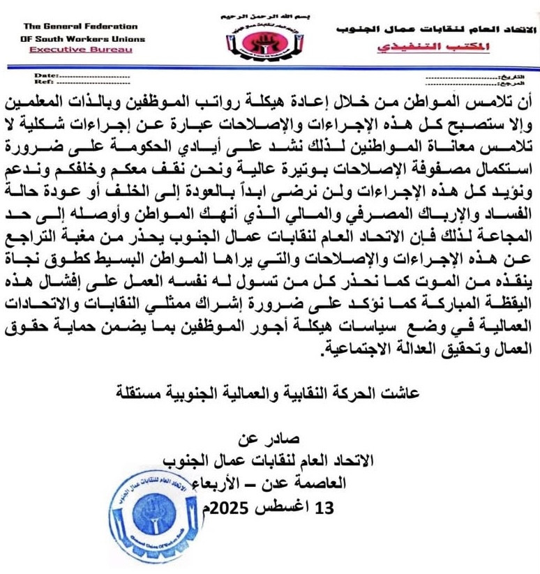 ويؤكد الاتحاد العام لنقابات عمال الجنوب دعمه الكامل لكل الإجراءات التي تصب في مصلحة الشعب، ويشدد على أهمية مواصلة هذه الإصلاحات والإجراءات بوتيرة متسارعة وأن تلامس هذه الإجراءات والإصلاحات يجب أن تلامس المواطن من خلال إعادة هيكلة رواتب الموظفين وبالذات المعلمين وإلا ستصبح كل هذه الإجراءات والإصلاحات عبارة عن إجراءات شكلية لا تلامس معاناة المواطنين.