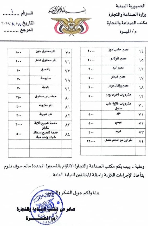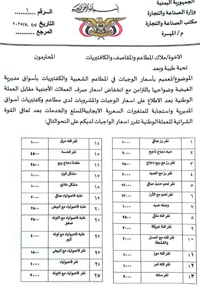 أصد مكتب وزارة الصناعة والتجارة بمحافظة المهرة ، اليوم الأحد تعميماً جديداً بشأن تحديد أسعار الوجبات في المطاعم الشعبية والمقاصف والكافتيريات بأسواق عاصمة المحافظة وذلك بالتزامن مع انخفاض أسعار صرف العملات الأجنبية مقابل العملة الوطنية وما تبعه من تراجع نسبي في أسعار السلع والخدمات.