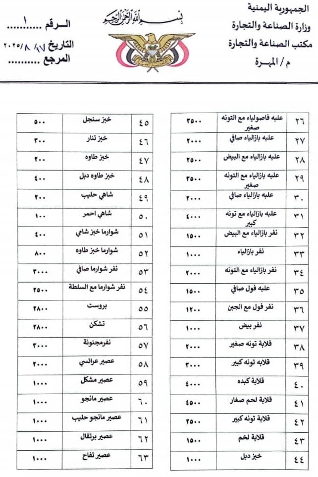 تعميم رسمي بمحافظة المهرة يحدد أسعار الوجبات في المطاعم الشعبية والكافتيريات